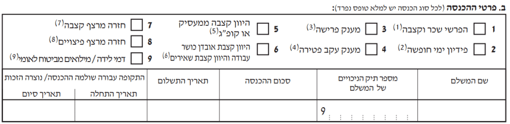 בסעיף ב – יש למלא את פרטיי ההכנסה אותה מבקשים לפרוס. יש למלא את סוג ההכנסה – אם מדובר במענק פרישה, פריסה של היוון קצבה, הפרשי שכר או פדיון חופשה.